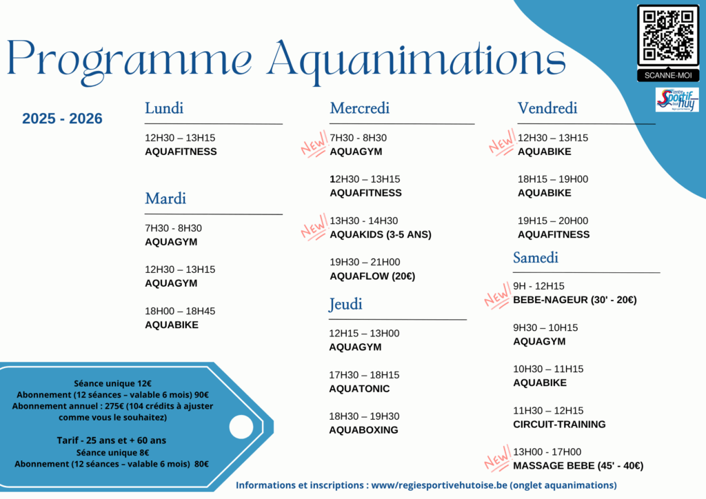 Pour bénéficier du tarif réduit (-25 ans ou +60 ans), envoyez une photo de votre carte d’identité à aquahuy@regiesportivehutoise.be.